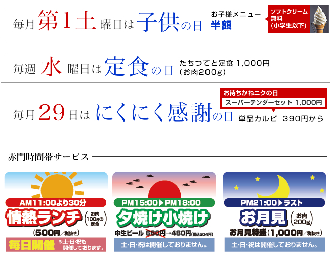 http://www.akamon.co.jp/index.html 焼肉赤門 毎月29日に「肉の日」 (^.^) 食べたい~食べに行きたい